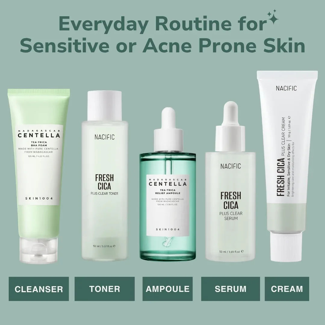 This Everyday Routine for Sensitive or Acne Prone Skin combines soothing and clarifying ingredients to balance and refresh the skin. The SKIN1004 Madagascar Centella Tea-Trica BHA Foam gently cleanses, while the NACIFIC Fresh Cica Plus Clear Toner and Serum help to calm and hydrate with Centella Asiatica and tea tree extracts. The SKIN1004 Madagascar Centella Tea-Trica Relief Ampoule provides targeted relief for irritated skin, and the NACIFIC Fresh Cica Plus Clear Cream locks in moisture for a smooth, clear complexion. Together, these products work to promote a healthier, clearer, and more balanced skin appearance.