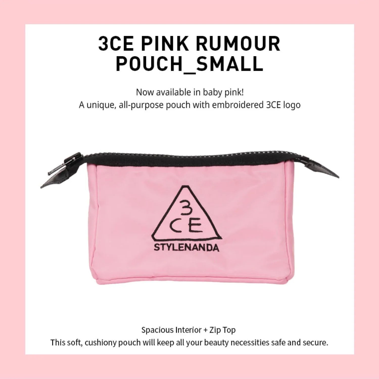 The 3CE Small Pouch in Pink Rumour is a delightful and compact accessory designed to add a touch of style and convenience to your everyday life. This small-sized pouch is perfect for carrying your essentials, whether it's makeup, jewelry, or small gadgets. Its heart-throbbing milky pink color, coupled with the elegant "Rumour" detailing, adds a trendy and chic flair to your accessories collection.