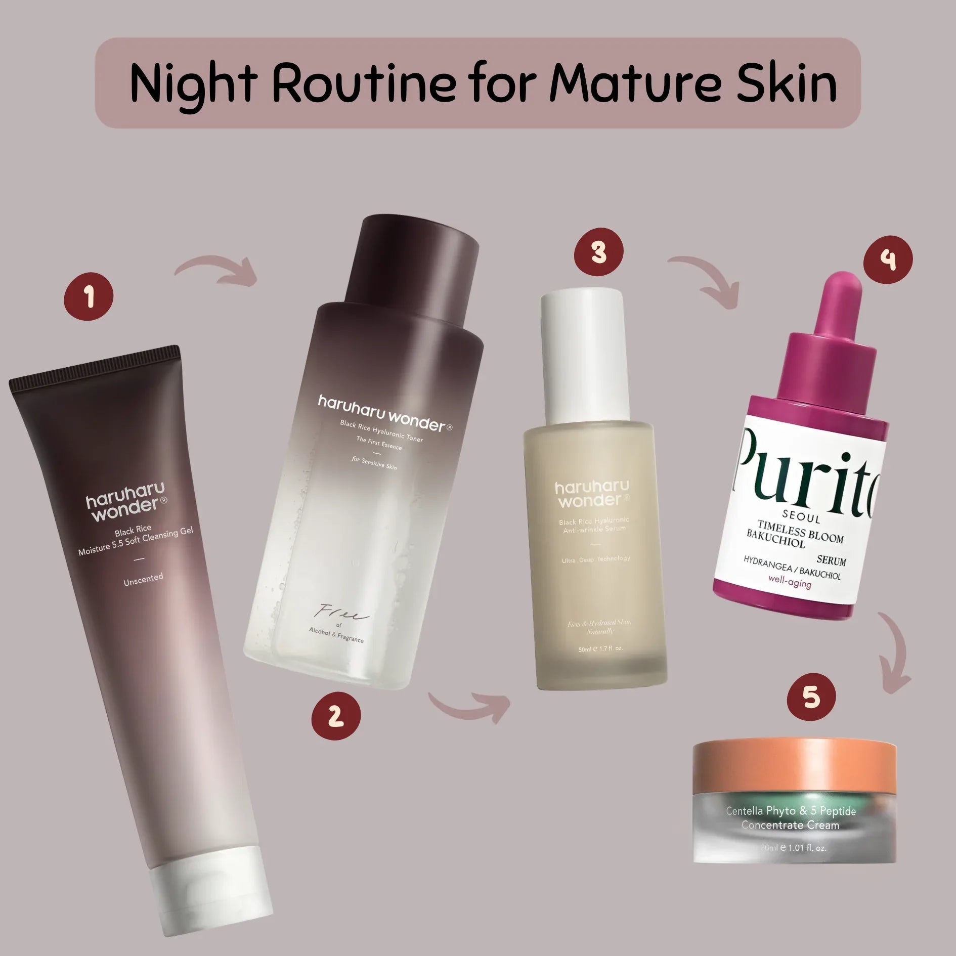 Start with the Black Rice Moisture 5.5 Cleanser, a pH-balanced, fine-bubble gel that deeply cleanses without irritation using coconut-derived surfactants. Follow with the Unscented Toner, fragrance-free and rich in fermented black rice to calm and prep sensitive skin. Apply the Black Rice Anti-Wrinkle Serum for firming and elasticity, powered by Korean black rice and Ultra Deep Technology. Layer the PURITO Bakuchiol Serum to gently smooth texture and boost radiance, even for sensitive skin. Finish with the Black Rice Hyaluronic Essence, delivering deep hydration and nourishment with hyaluronic acid, betaine, and fermented black rice.