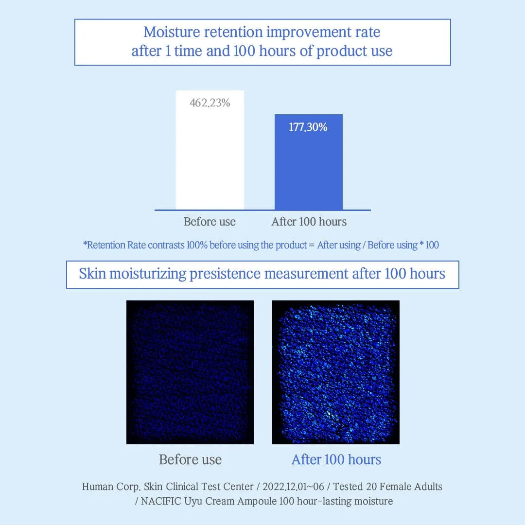 The UYU Cream Ampoule uses milk from Jeju Island, known for its purity and freshness. With a milk extract concentration of 150,000PPM, this cream ampoule offers superior moisturization and hydration that lasts for up to 100 hours. The milk's rich nutrients penetrate deep into the skin to provide long-lasting nourishment, leaving your skin feeling soft, supple, and rejuvenated.