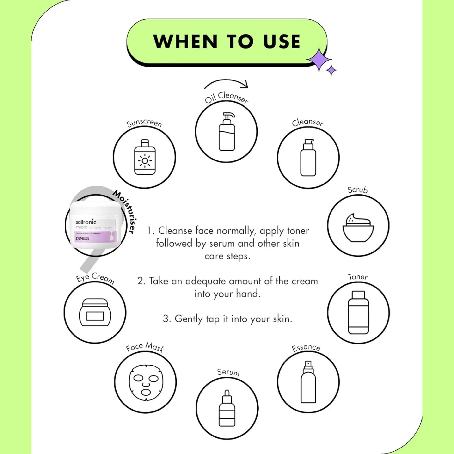 SNP PREP Salironic Cream, a refreshing gel-cream that smooths, soothes, and deeply hydrates the skin. Formulated with gentle exfoliating ingredients like betaine salicylic acid, AHA, PHA, and 10,000 ppm of Houttuynia Cordata, it helps refine keratin buildup and calm irritation. A blend of six types of hyaluronic acid delivers long-lasting moisture, improving texture and softness. Clinically tested for low irritation, this formula is ideal for sensitive and dry skin.