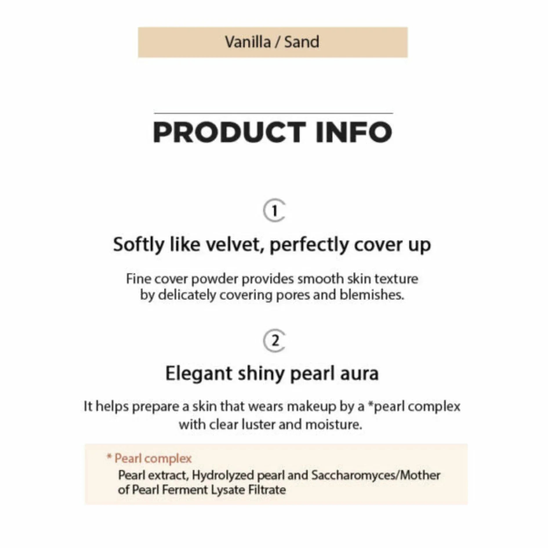 Long lasting powder pact to help provide smooth cover and radiance to the skin. Fine cover powder provides smooth skin texture by delicately covering pores and blemishes. It helps prepare a skin that wears makeup by a *pearl complex with clear luster and moisture. Pearl extract, Hydrolyzed pearl and Saccharomyces/Mother of Pearl Ferment Lysate Filtrate.