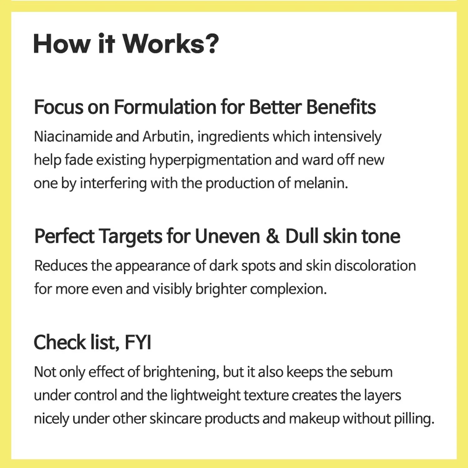 • Enriched with 10% Niacinamide + Arbutin, it improves uneven tone, minimizes pores, and strengthens the skin barrier while reducing acne marks.