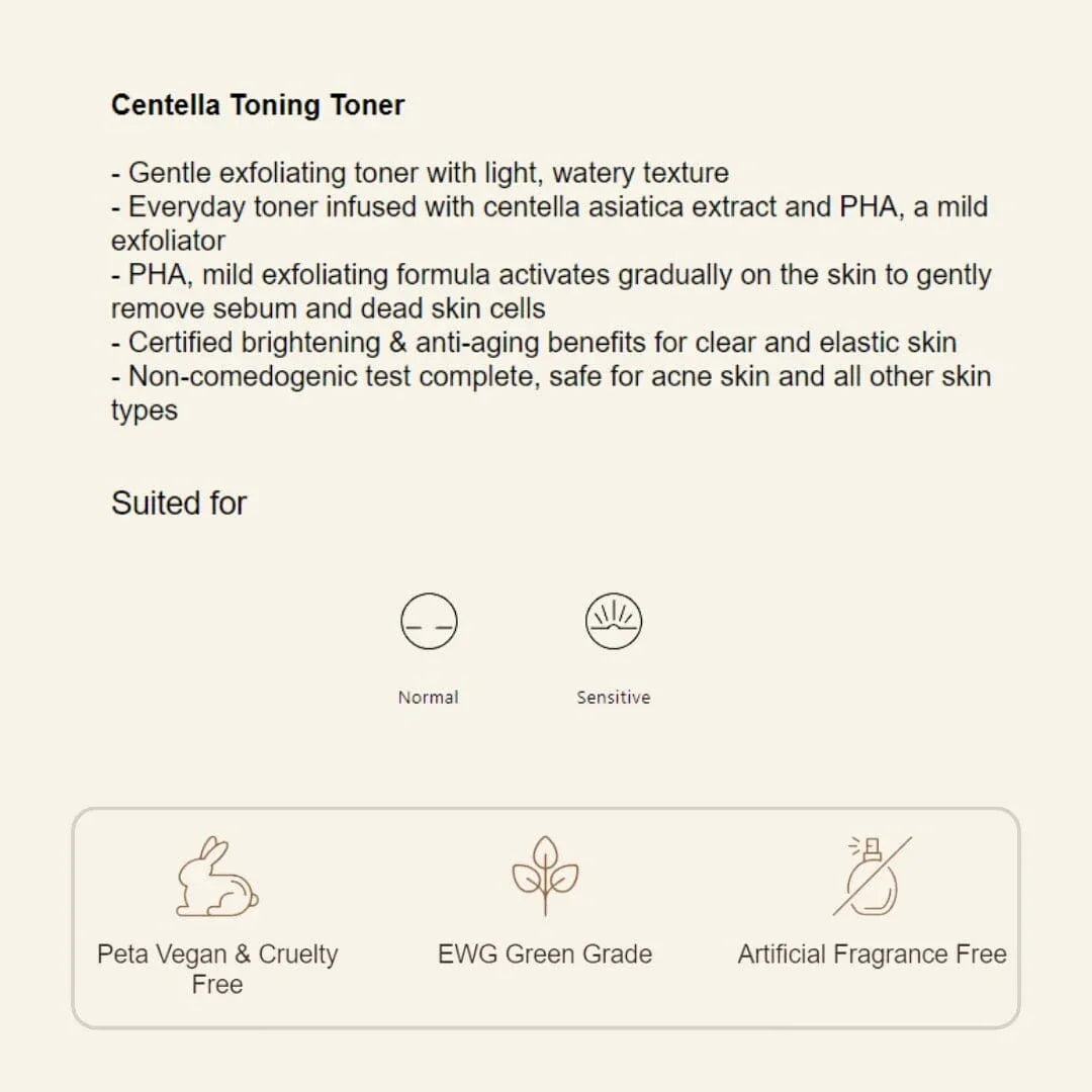A gentle PHA toner that soothes, exfoliates, hydrates and brightens in equal measure. It contains 84% centella asiatica extract, hyaluronic acid, betaine, alongside other brightening and anti-aging ingredients to produce a fresh, supple, wrinkle-free finish. To use, soak a proper amount in cotton pad and wipe onto cleansed face, patting gently for optimal absorption.