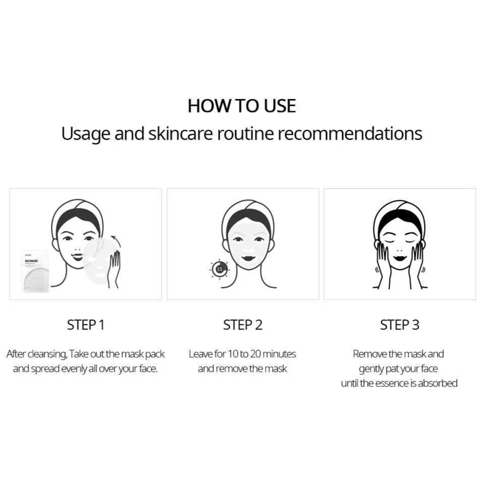 A mask pack with high adherence that combines Niacinamide and Hyaluronic acid to brighten and hydrate the skin.