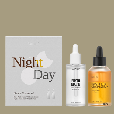 The NACIFIC Day & Night Set consists of two skincare products: the Fresh Herb Origin Serum and the Phyto Niacin Brightening Essence. The serum provides hydration and improves skin texture, while the essence focuses on brightening and evening out the skin tone. This set offers a comprehensive skincare routine for day and night, promoting a hydrated, radiant, and even complexion.