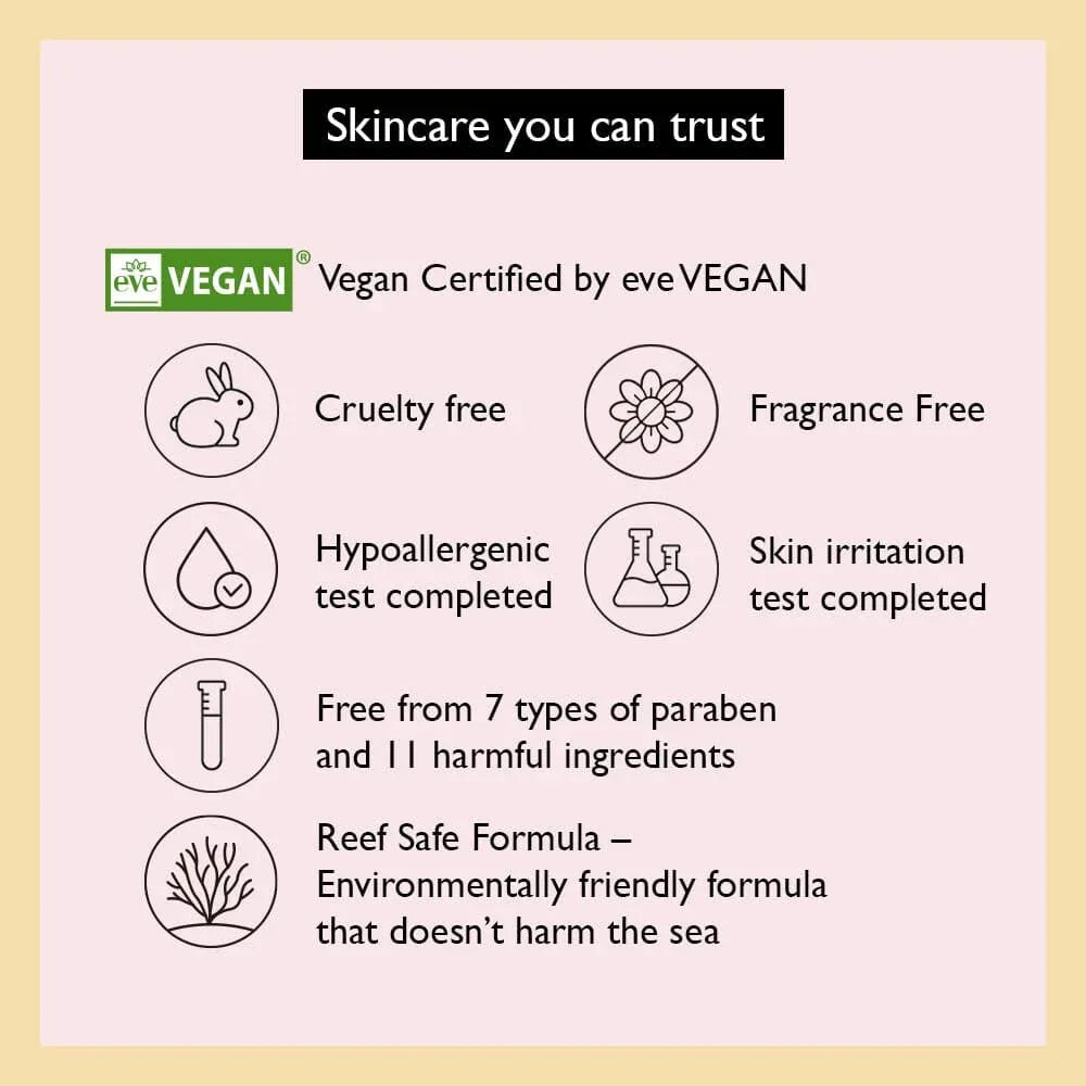 Application Feel: Applies on the skin with a refreshing and smooth finish, without stickiness. Due to zinc oxide, there may be some white cast upon application, massage into the skin thoroughly to blend in.