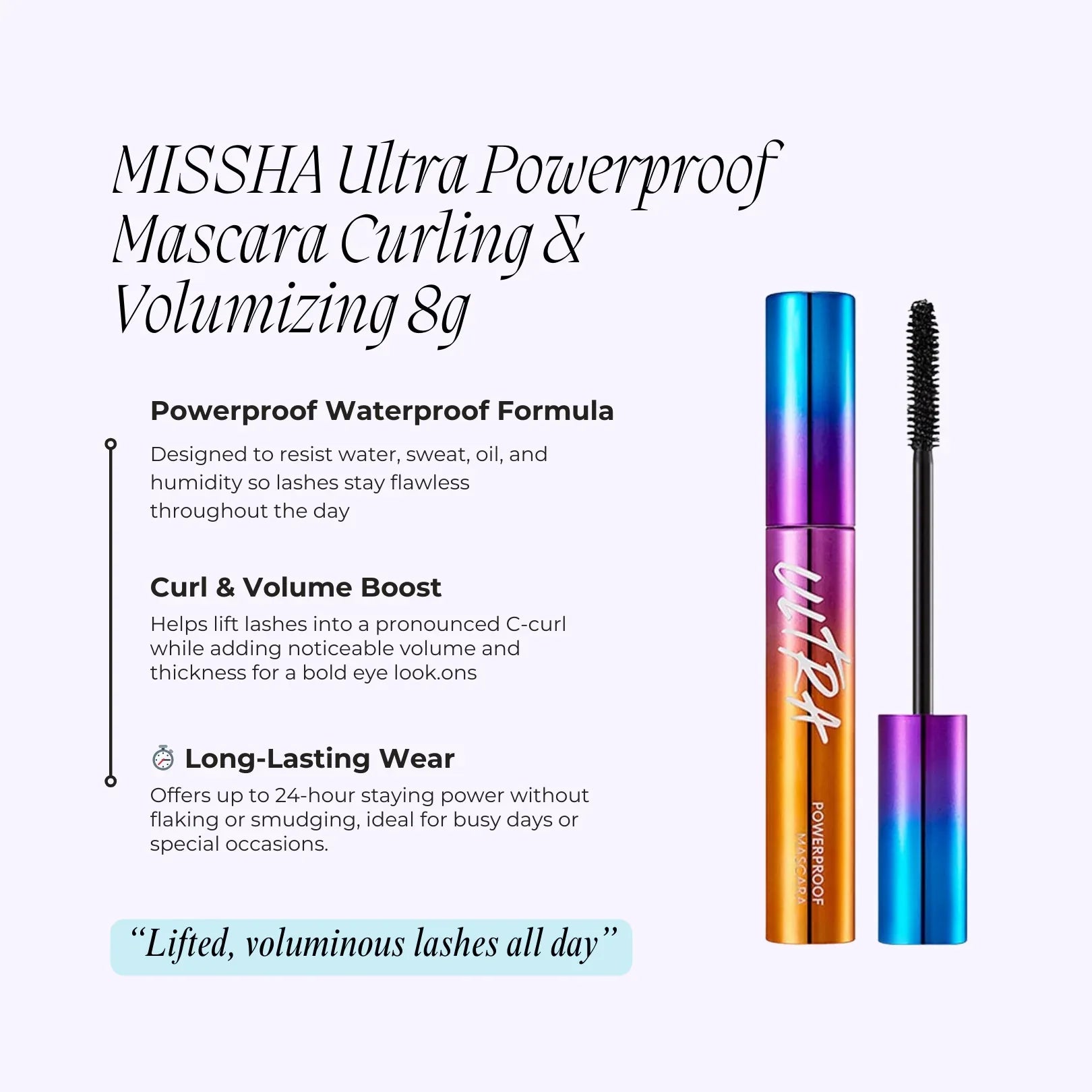 MISSHA Ultra Powerproof Mascara Curling & Volumizing is a standout product in the realm of eye makeup, offering both dramatic curl and amplified volume to your lashes. This mascara is tailored to endure various conditions, providing long-lasting wear without compromise.