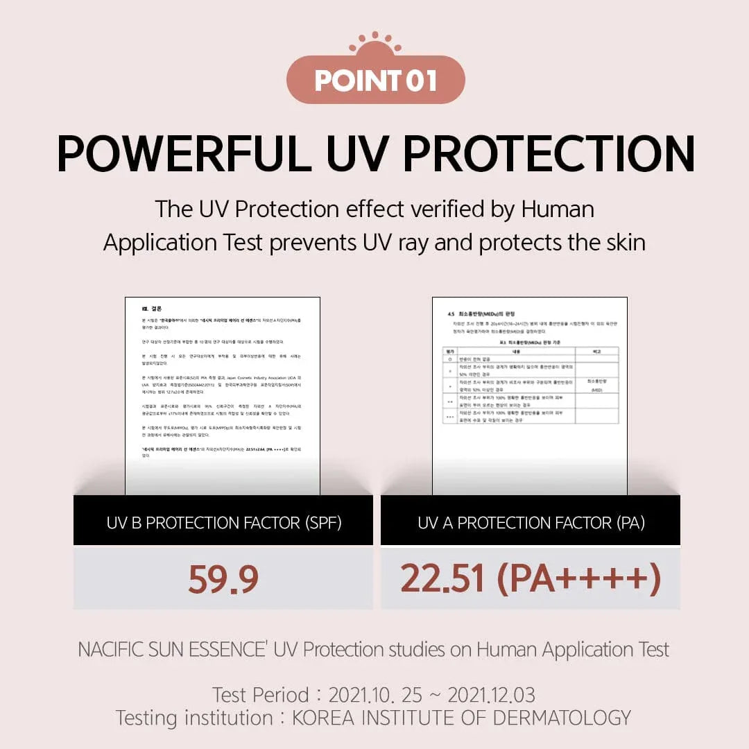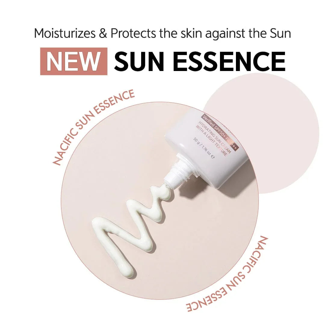 NACIFIC Vegan Sun Essence: Your certified vegan sunscreen, offering SPF50+/PA++++ protection against UV rays. Experience moisture-rich defense without irritation, with a lightweight, non-greasy feel. Enjoy all-day comfort that's perfect for reapplication, and the combined benefits of physical and chemical sunscreens.