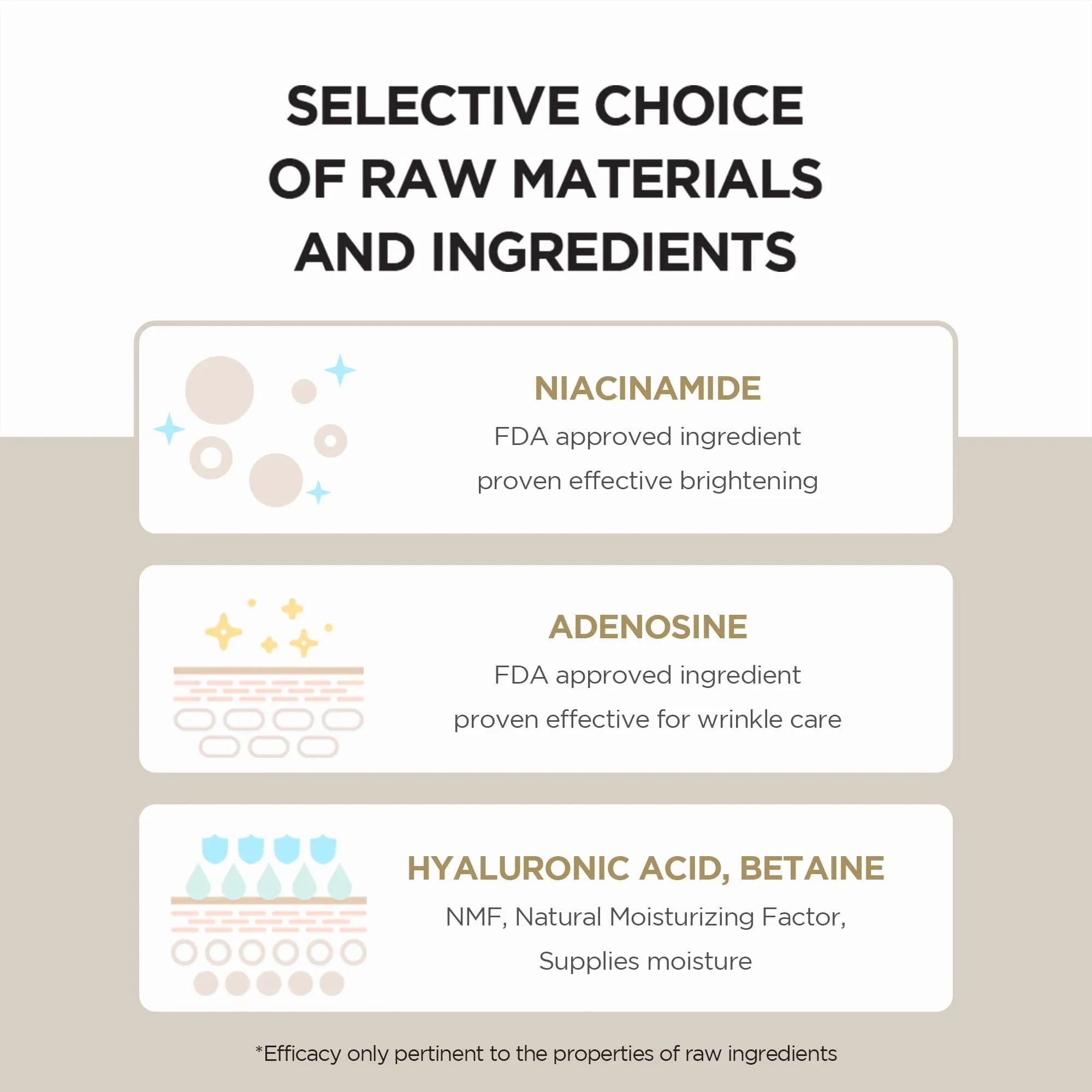 ✔ Niacinamide and adenosine deliver brightening and anti-wrinkle effects.