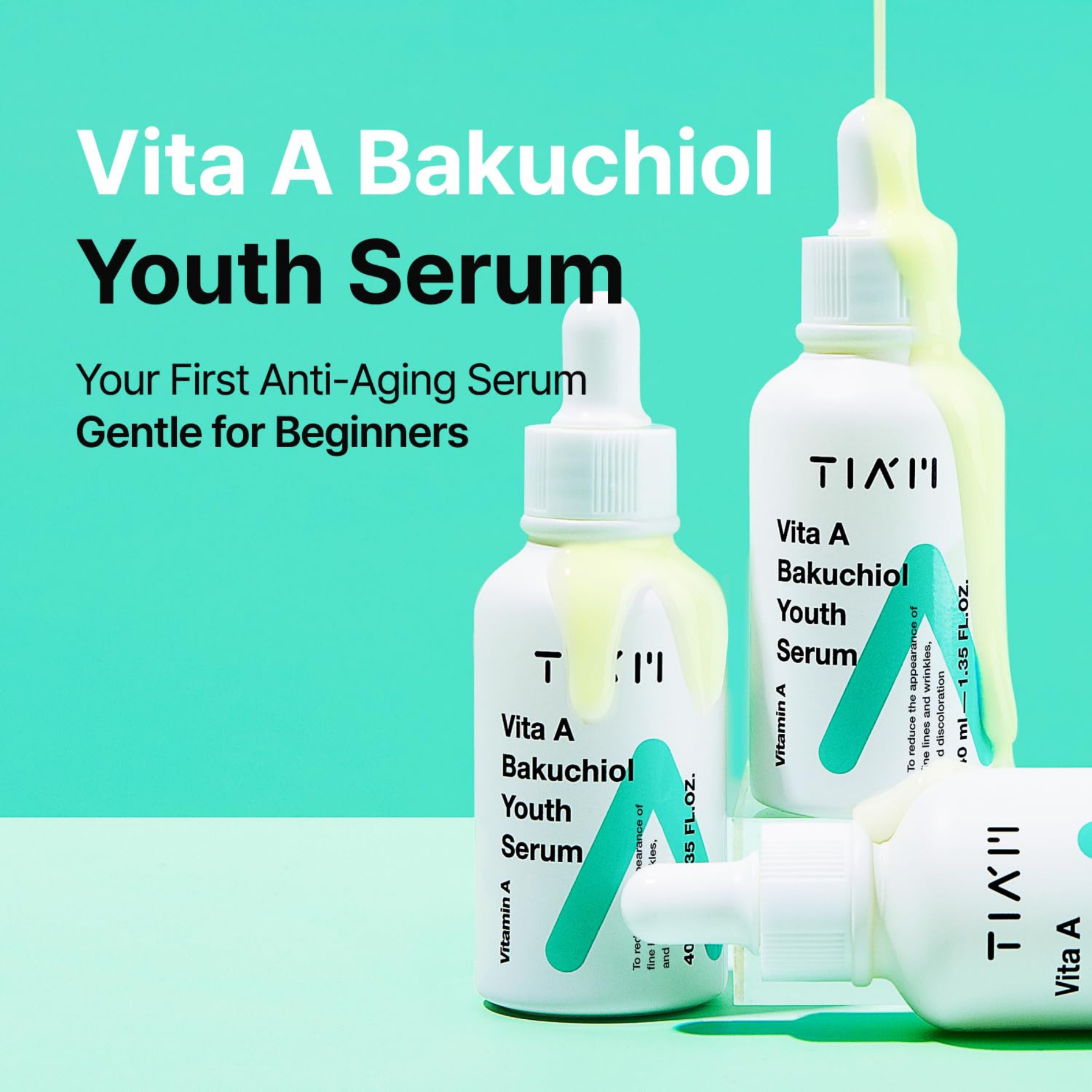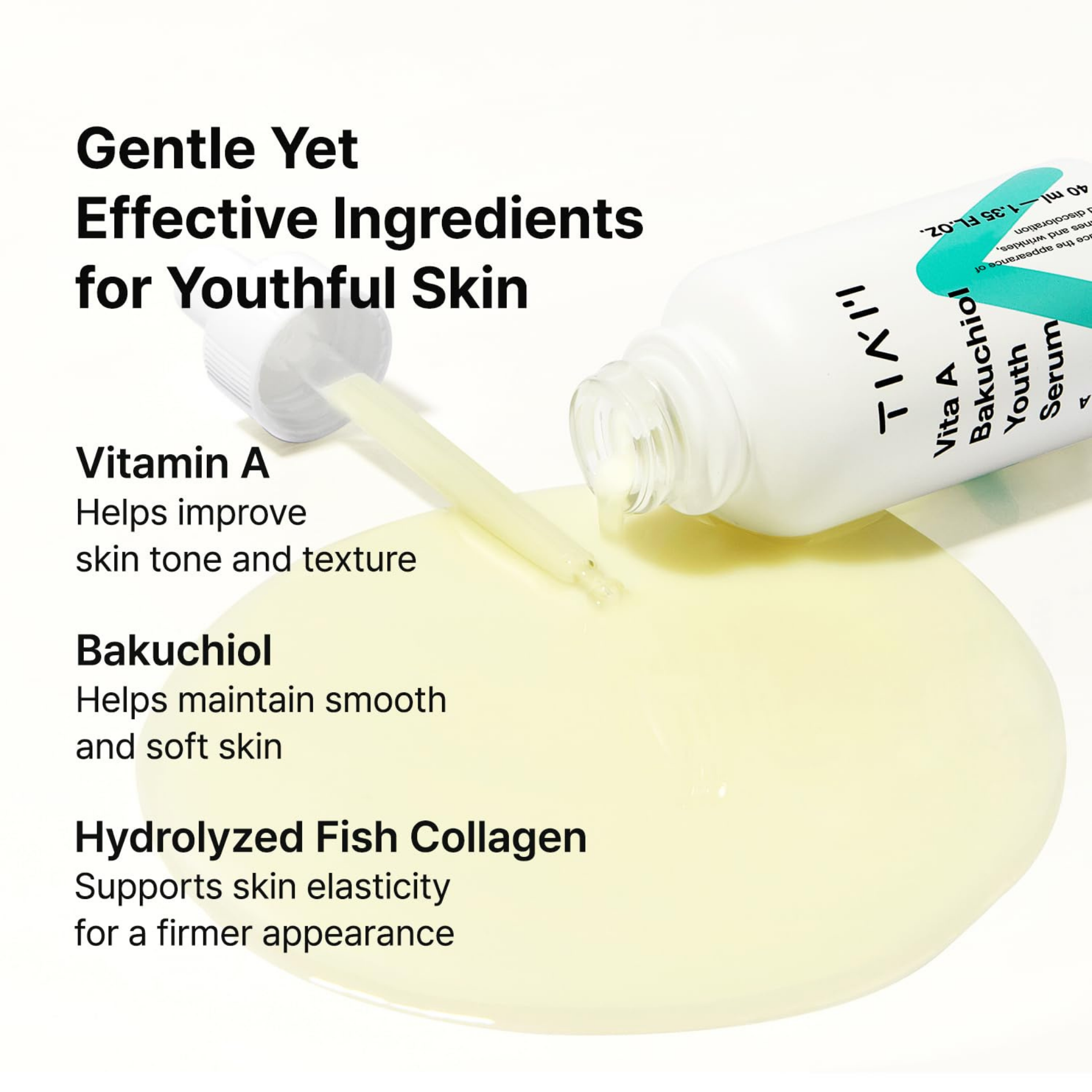 TIA'M Vita A Bakuchiol Youth Serum, infuced with Vitamin A + Bakuchiol + Fish Collagen, an anti-aging serum that helps to slow down the sings of aging like flind lines and wrinkles, discoloration, and loss of firmness.